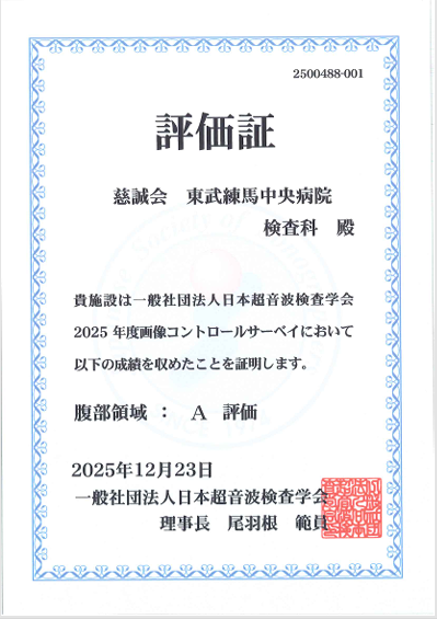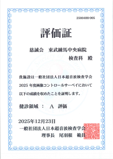 この度、当院検査科が参加いたしました一般社団法人日本超音波検査学会主催の「2025年度画像コントロールサーベイ」におきまして、以下の2つの領域で最高評価である 「A評価」 を取得いたしました。